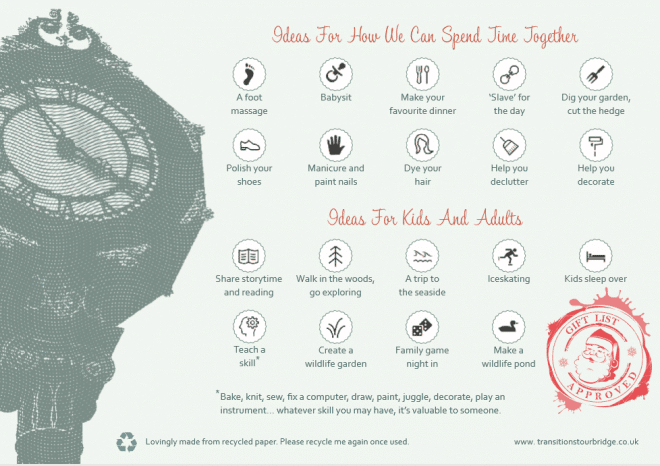 Christmas is a time of giving … but it doesn’t have to be giving ‘things’. Plastic Free Stourbridge have come up with this great way of reminding us that what makes Christmas special is spending time with loved ones, friends & family and our wider community. Giving the gift of time is THE ultimate plastic-free Christmas pressy.